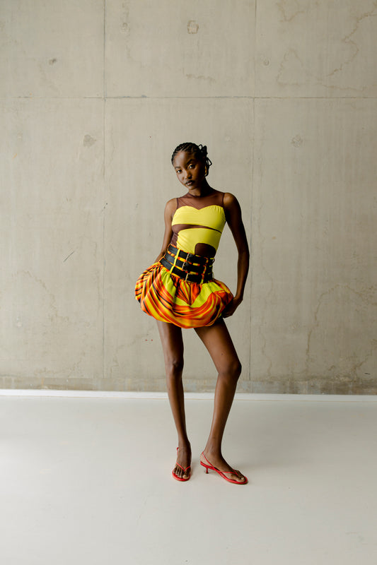 Double band print puff mini skirt Made from Poly heaven satin and leather Delivery from...