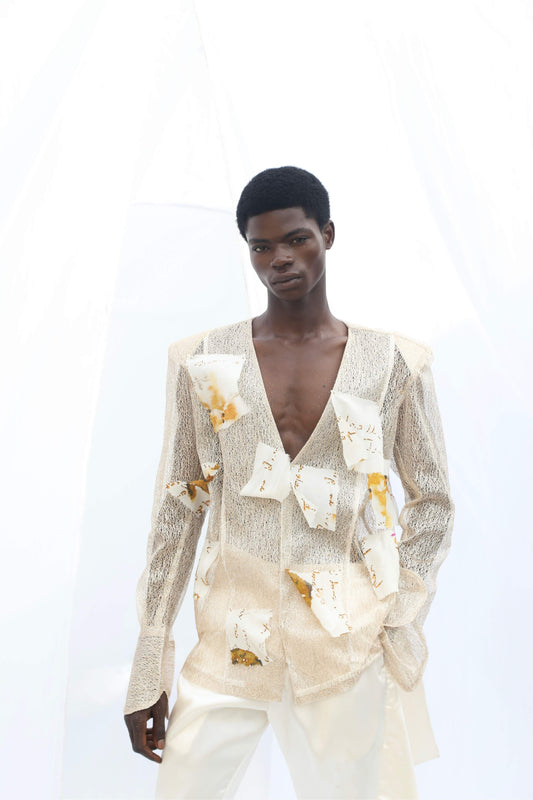Sheer button down shirt with patches of print made in collaboration with Artist Yasser Claud-Ennin...