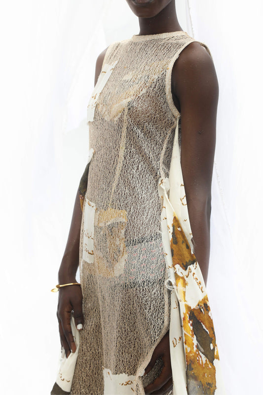 Sheer dress with patch print made in collaboration with Artist Yasser Claud-Ennin inspired by the...