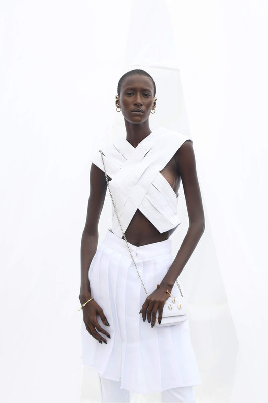 Sleeveless top with fringe and piping detail Made from Mikado and Fringe Made in Lagos,...