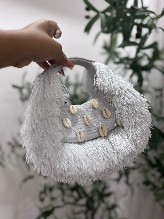 Handwoven Shekere fringe small bag made in collaboration with KISARA Made from Aso oke Made...