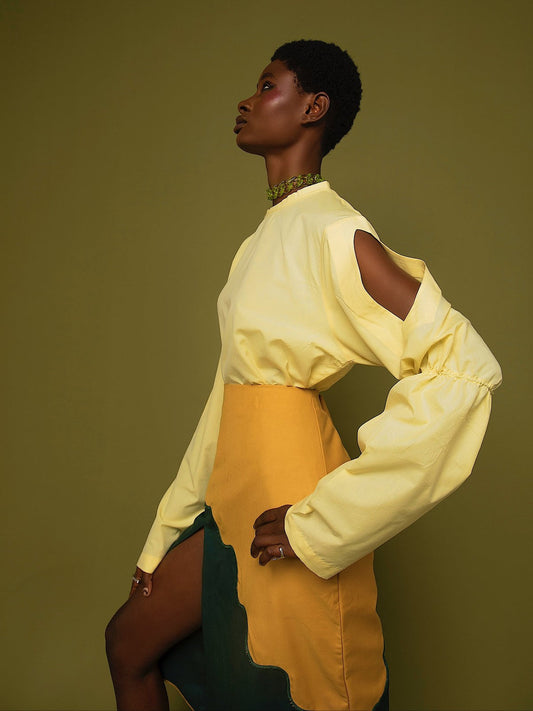 Made from locally sourced silk blend Made in Lagos, Nigeria Assymetric detailing Delivery January 2025...