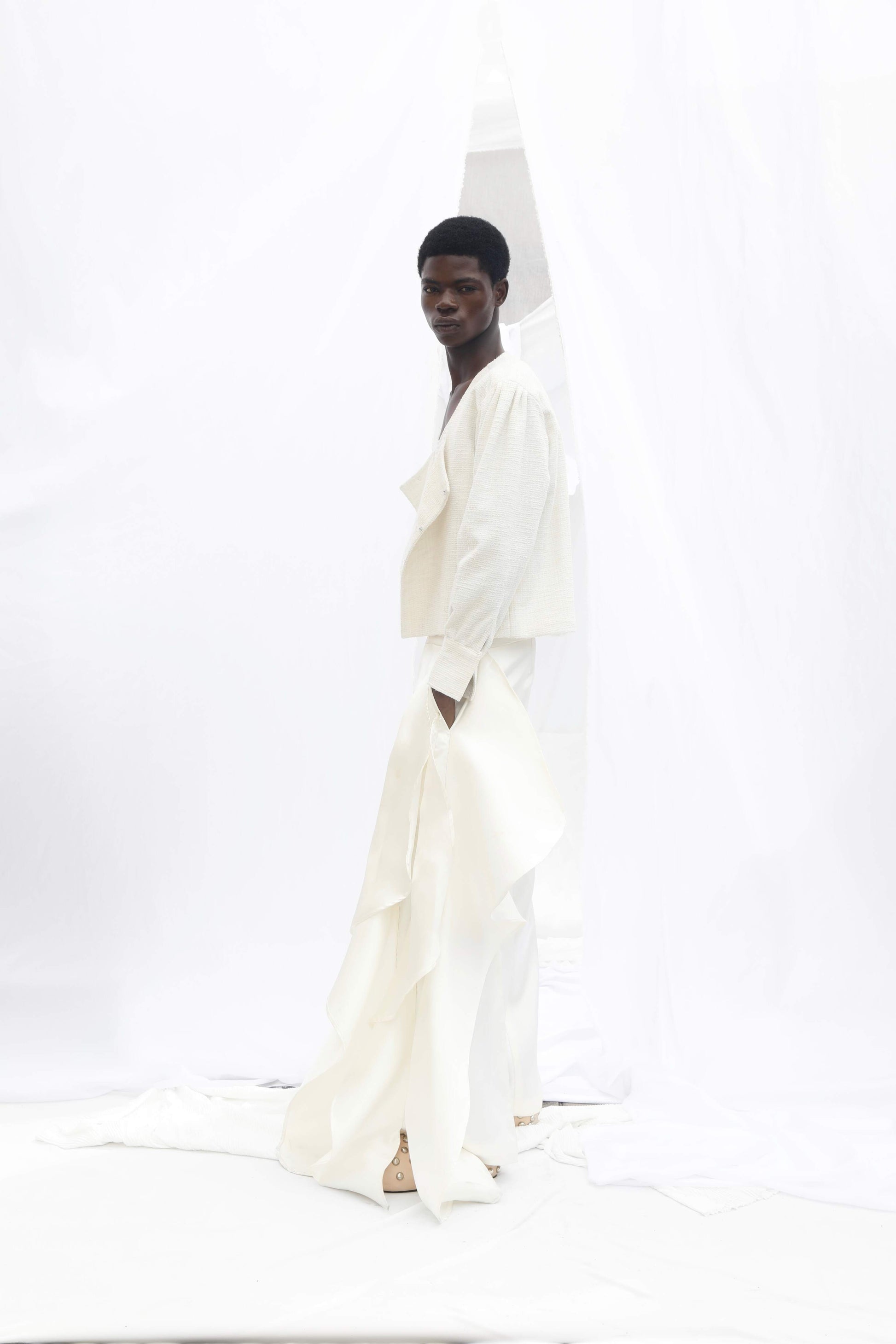- Flare trousers with exaggerated frill on one side and removable cummerbund