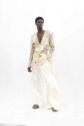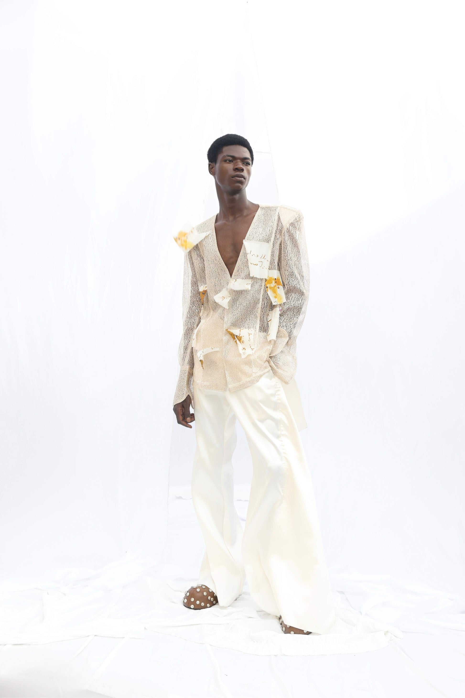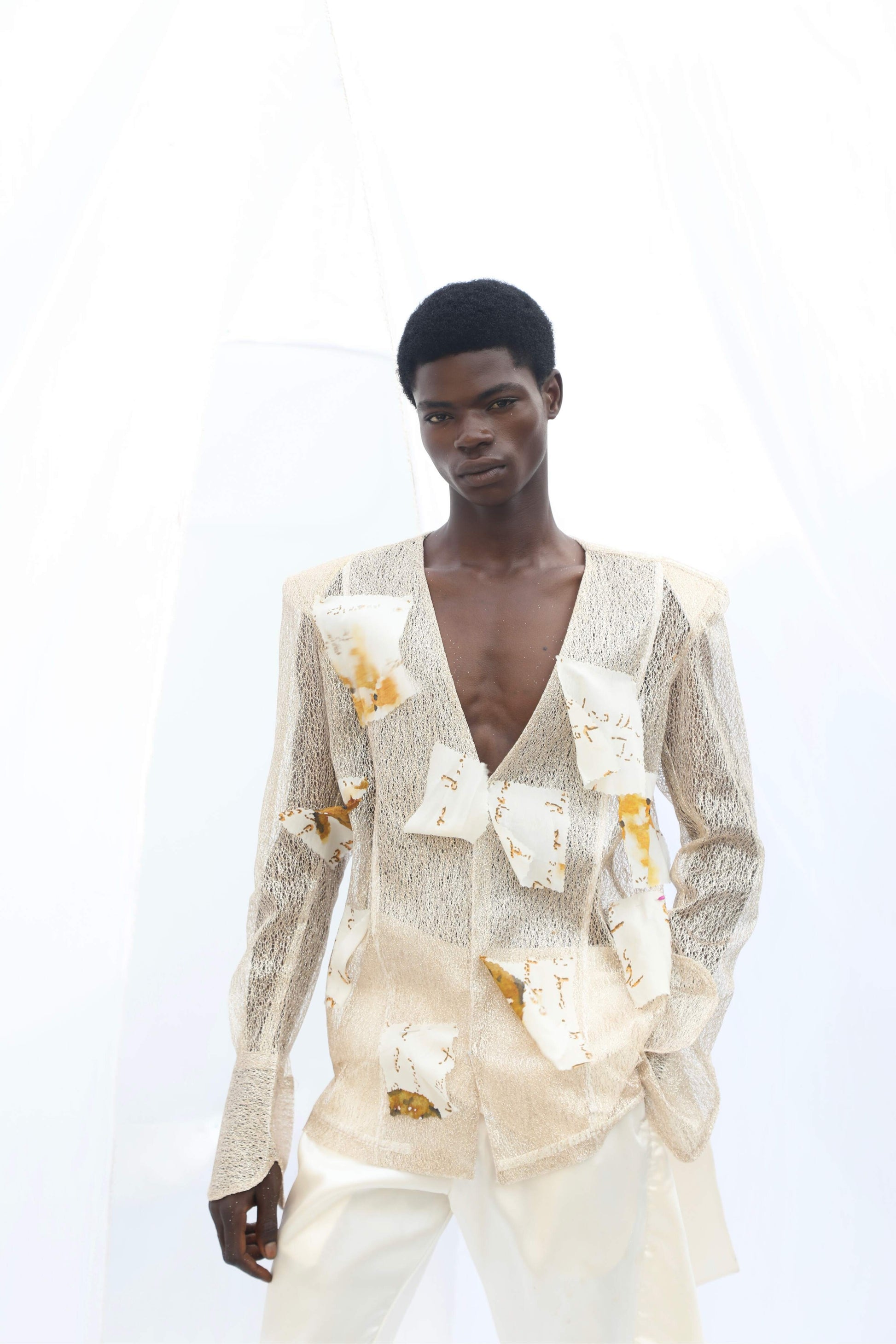 - Sheer button down shirt with patches of print made in collaboration with Artist Yasser Claud-Ennin inspired by the Late Justice Beatrice Adesuwa Oke-lawal