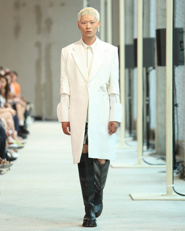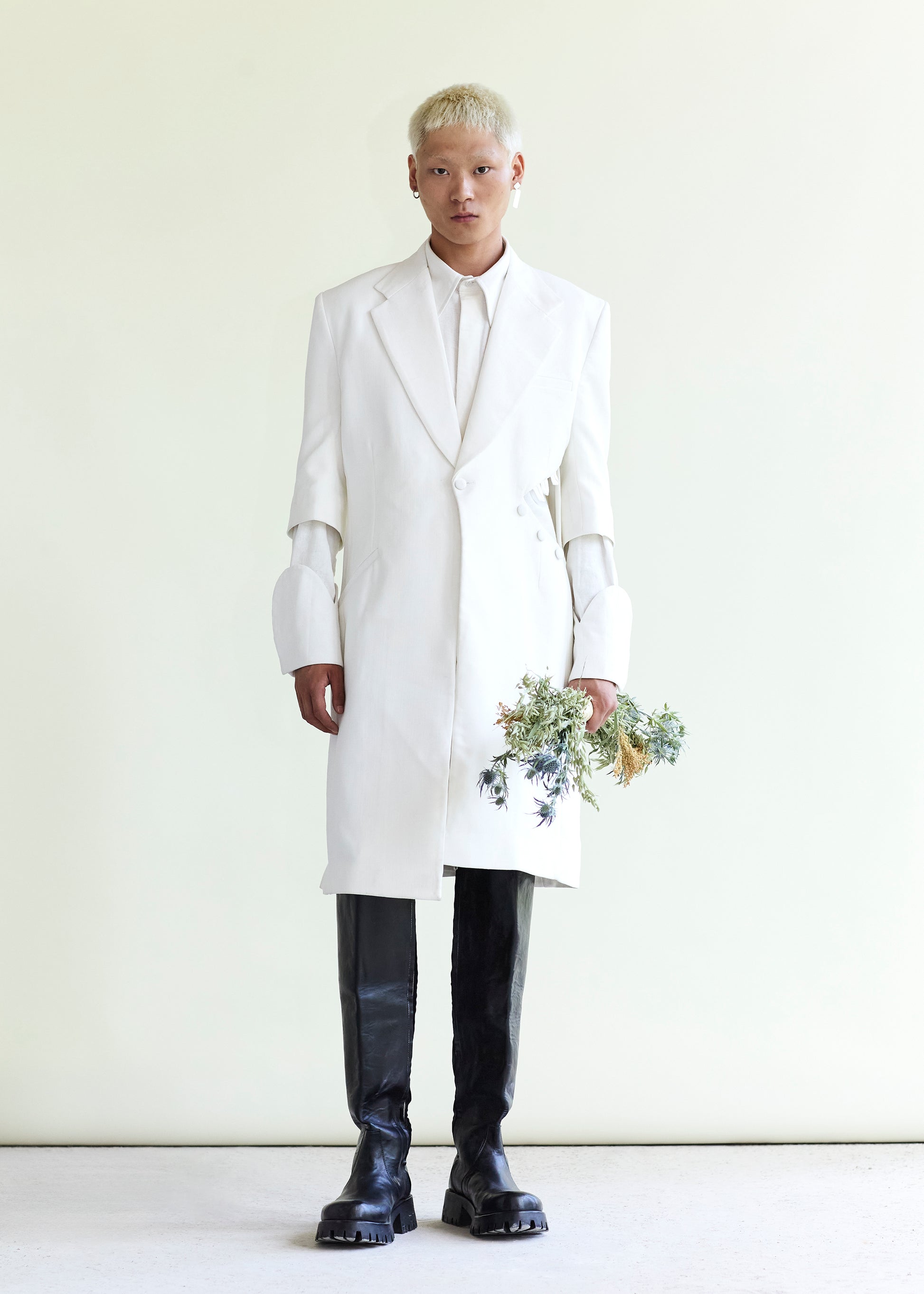 - Asymmetric overcoat with elbow length sleeve and cut out detail