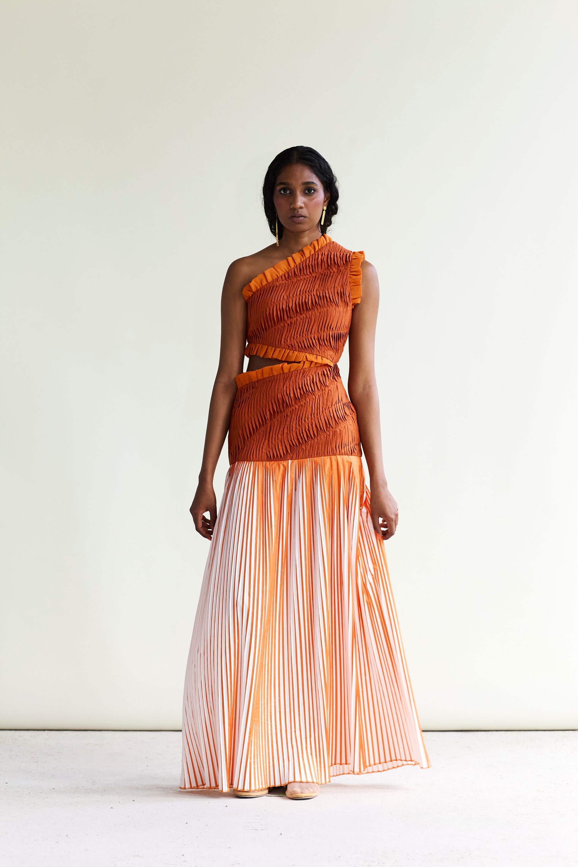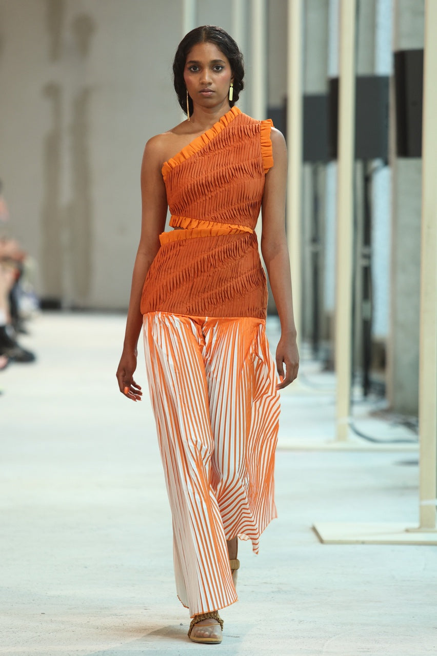 - Hand pleated bodace dress with pleated two tone skirt detail